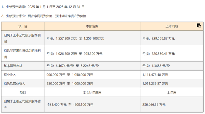 深康佳A的主要业务有消费电子业务、半导体业务、PCB业务等。1月30日,深康佳A发布的2025年度业绩预告显示,报告期内,该公司归母净利润预亏125.81亿元至155.73亿元,归属于上市公司股东的净资产为-53.34亿元至-80.01亿元。