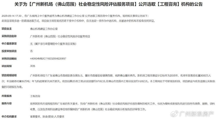 根据最新的招标信息,珠三角枢纽(广州新)机场位于广东省佛山市高明区更合镇东北、肇庆市高要区蛟塘镇西侧,地跨佛山肇庆两市,项目估算(机场工程)总投资额约370亿元。