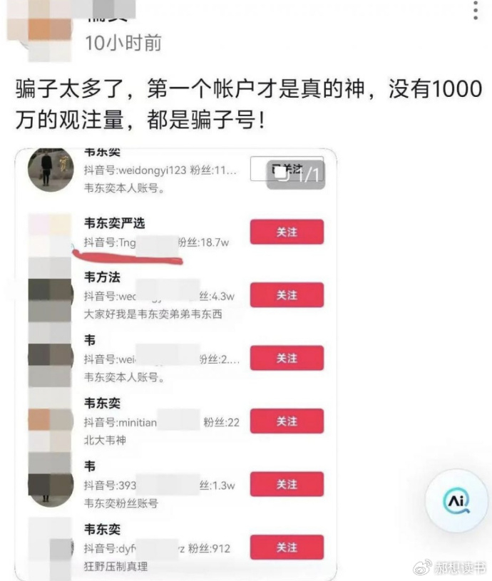 更荒诞的闹剧接踵而至,随着账号走红,各大平台突然冒出几十个“韦神本神”,官方也不得不出手封禁。