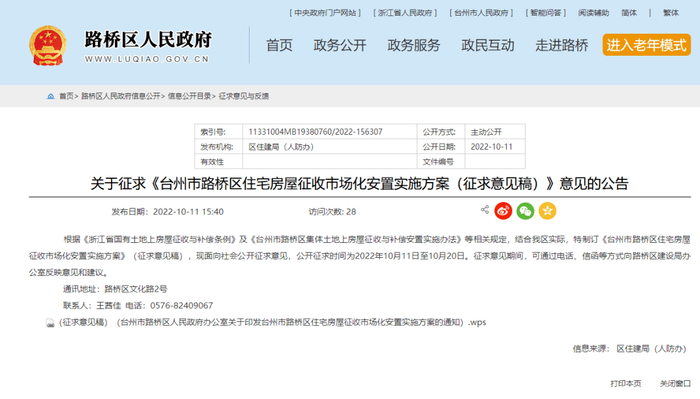 公告显示:《台州市路桥区住宅房屋征收市场化安置实施方案》(征求意见稿),现面向社会公开征求意见,公开征求时间为2022年10月11日至10月20日。