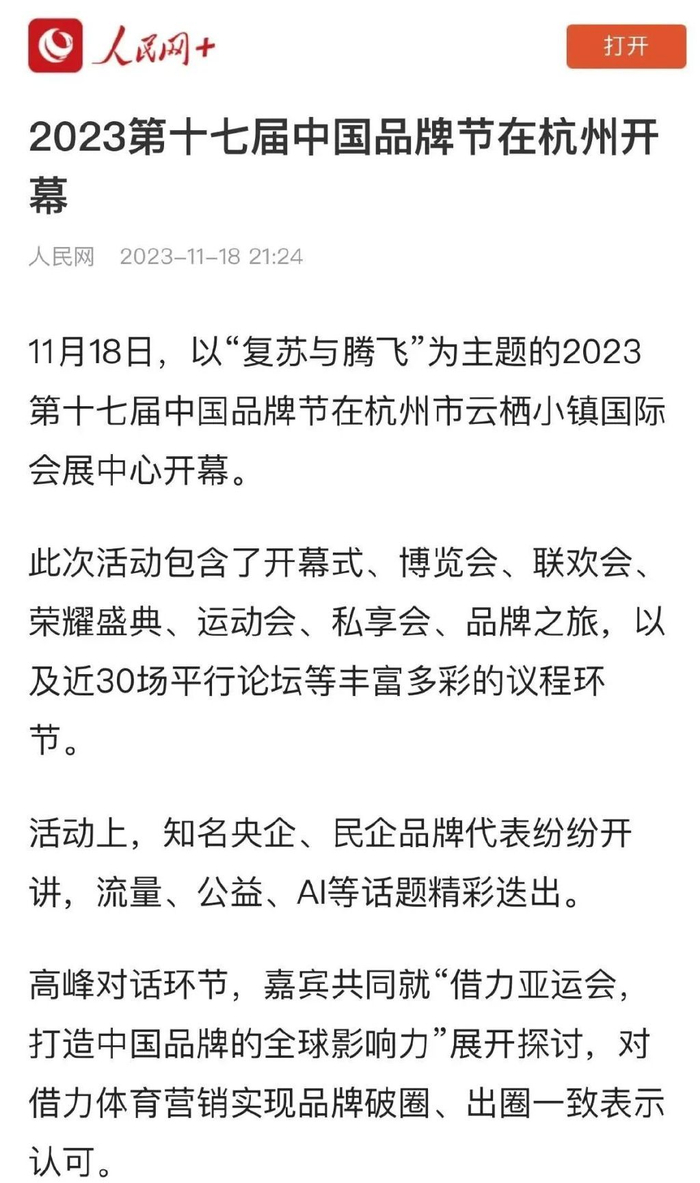 2023年11月17日-20日由品牌联盟主办的2023第十七届中国品牌节(简称“2023中国品牌节”)以“复苏与腾飞”为主题在杭州成功举办活动采用“1938”模式包含了1场大型开幕式博览会、运动会、荣耀盛典、品牌之旅等9场重要活动城市品牌论坛、AIGC营销论坛等38场平行论坛及系列活动