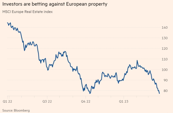 根据MSCI欧洲季度房地产指数,房地产估值较2022年6月的峰值下降约10%。花旗集团预测,到明年年底,西欧的估值将进一步下降20%至40%,而同期房地产股的价值可能会减半。