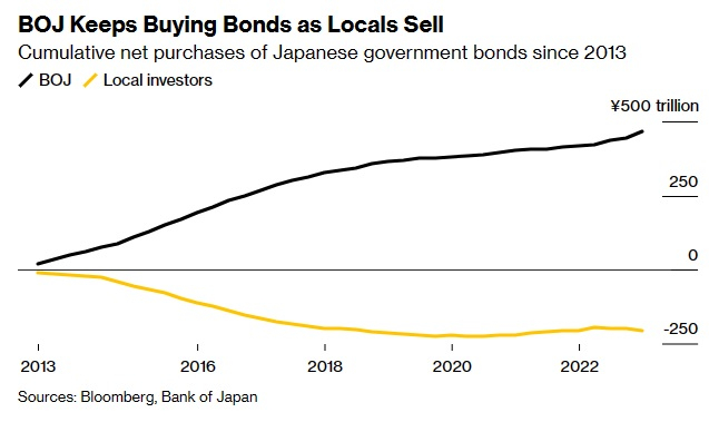 据日本央行的数据,自黑田东彦10年前实施量化宽松政策以来,日本央行已购买了465万亿日元(约合3.55万亿美元)的日本政府债券,压低了收益率,加剧了主权债务市场前所未有的扭曲。结果,日本本土基金在此期间卖出了206万亿日元的日本国债,到其他地方寻求更好的回报。