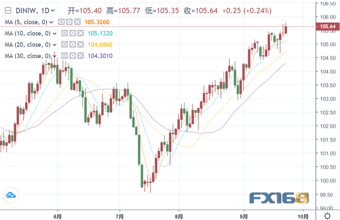 追踪美元兑六大主要货币的美元指数周五上涨0.16%,至105.55。该指数有望维持约0.2%的周涨幅,这是数周以来的第10次上涨。