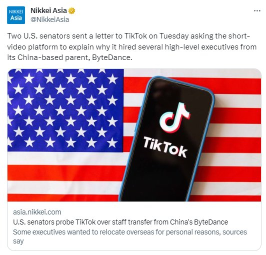 “我们担心这些人事变动会破坏美国数据的安全,以及TikTok就其独立于字节跳动所做的声明,”信函中提到。