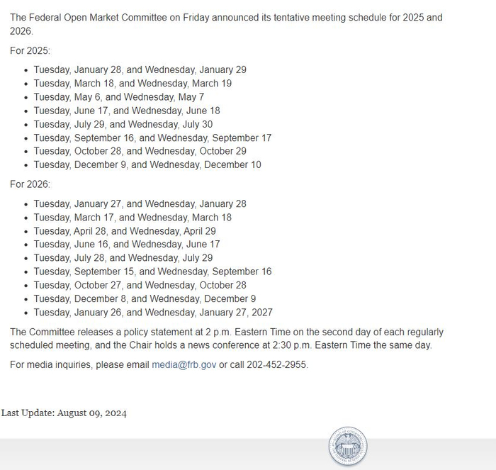 FX168财经报社(北美)讯 美联储公开市场委员会(FOMC)于周五(8月9日)公布了2025年和2026年的初步会议时间安排。
