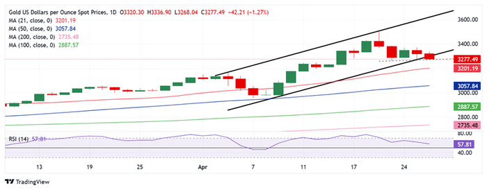 Mehta指出,从日线图上看,金价在创纪录上涨后出现回调,似乎将跌破长达三周的上涨通道。14日相对强弱指数(RSI)走低,目前接近58,支持金价最近的跌势。然而,该领先指标仍然保持在中线上方,这表明在3260美元/盎司的关键支撑区域(上周低点)可能会出现逢低买盘。