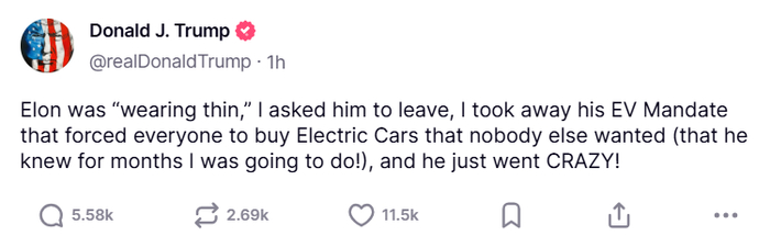 06:30 EST 特朗普在其社交平台Truth Social发文称:"埃隆已经'越界',我要求他离开,我撤销了强制所有人购买电动车的行政令(他早知我会这么做!),结果他就疯了!"