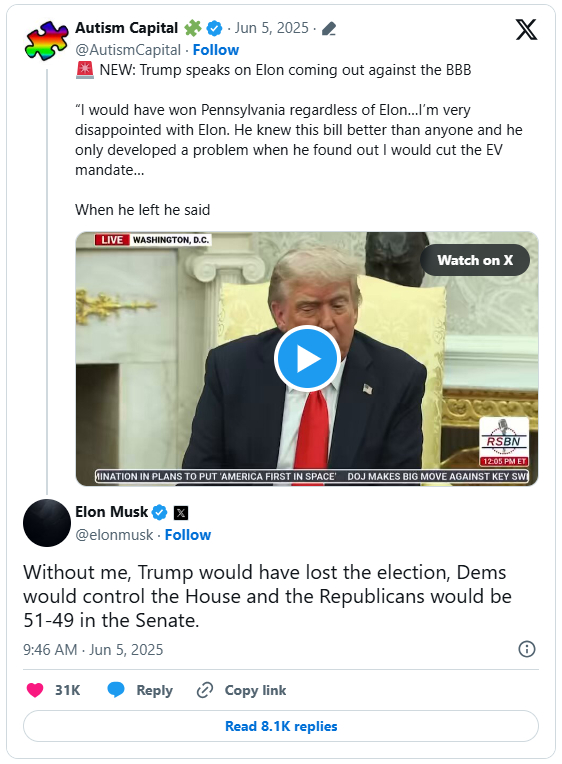 马斯克并未示弱。他在X(前Twitter)上连发帖反击,称特朗普的支出法案是“历史上最肮脏的立法之一”,“没有我,特朗普根本赢不了2024年大选,共和党甚至会丢掉参议院多数”。 他还发起了一项网络投票,问用户“是否应该创建一个真正代表80%中间派的新政党”,引发广泛讨论。