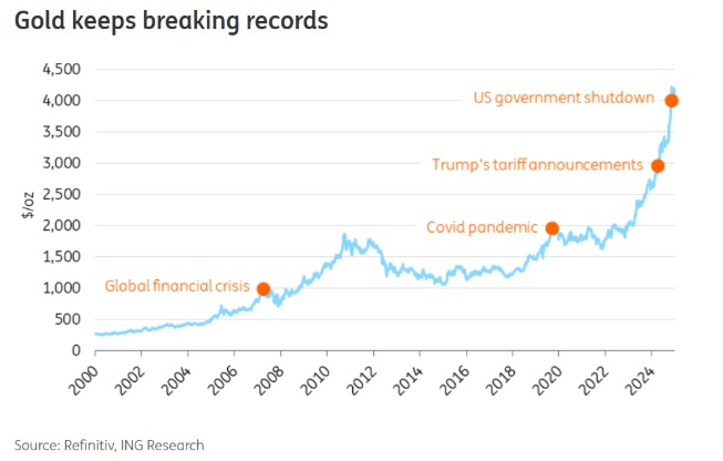 她写道:“在全球金融危机之后,金价突破了1000美元/盎司。在新冠疫情期间,黄金上涨至2000美元/盎司。然后,在特朗普宣布关税时,它突破了3000美元/盎司关口。在最近美国政府长期停摆期间,黄金突破了4000美元/盎司。”