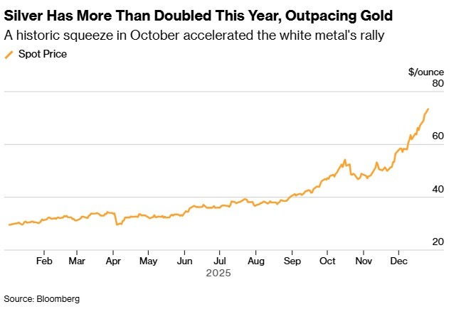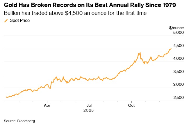 (截图来源:彭博社)今年以来,黄金累计上涨约70%,白银涨幅超过150%;两者都有望创下自1979年以来的最佳年度表现。这轮火热涨势的支撑因素包括:各国央行持续高位增持、资金流入交易所交易基金(ETF),以及美联储连续三次降息。较低的借贷成本对不生息的贵金属构成利好,交易员也在押注2026年还会进一步降息。
