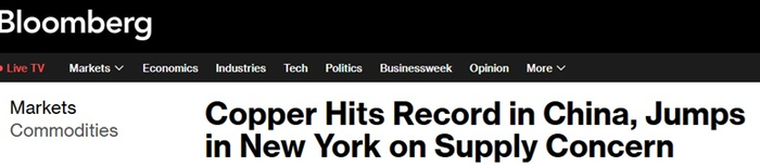 (截图来源:彭博社)在中国,上海期货交易所(Shanghai Futures Exchange)铜价上涨2.7%,至每吨98,780元人民币(14,090美元);在美国,COMEX铜期货上涨3%,触及每磅5.743美元。对美国这一基准价格而言,这是自7月出现史无前例的逼空行情以来的最高水平。