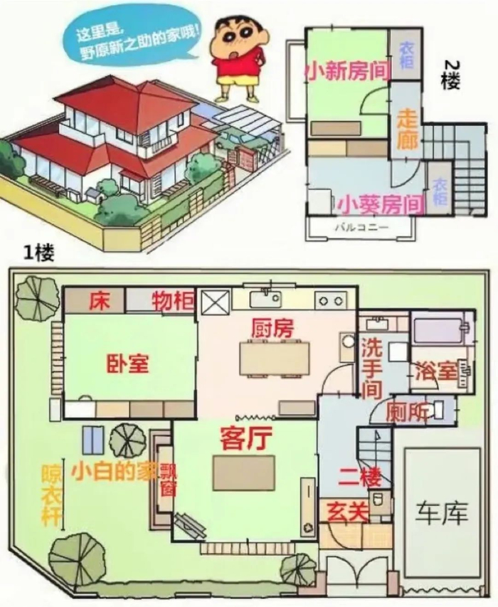 一些网友在致敬经典时,意外扒出一个冷知识:小新家的独栋二层小别墅是三室两厅。广志美伢、小新各住一间房,空置的客房在二胎妹妹野原向日葵出生后晋升婴儿房。