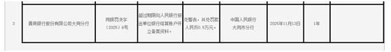 中国经济网北京11月17日讯 中国人民银行大同市分行近日公布的行政处罚决定信息公示表(同银罚决字〔2025〕6号)显示,晋商银行股份有限公司大同分行超过期限向人民银行报送单位银行结算账户开立备案资料。