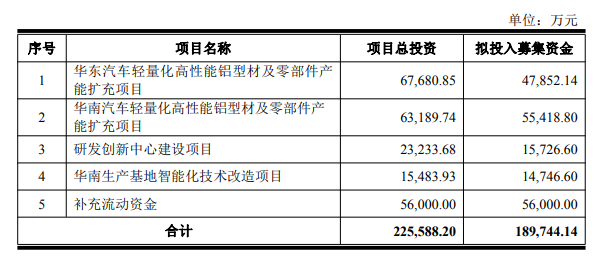 豪美新材上市募集资金总额为636,862,713.48元,扣除发行费用后募集资金净额为589,893,500.00元。2020年5月6日披露的招股书显示,公司拟募集资金58,989.35万元,用于铝合金新材建设项目、研发中心建设项目、补充流动资金。