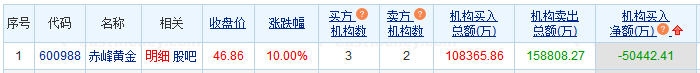 龙虎榜数据显示,买入赤峰黄金金额最大的前5名中,3家为机构专用席位。卖出赤峰黄金金额最大的前5名中,2家为机构专用席位。经统计,机构席位今日卖出赤峰黄金净额为50442.41万元。