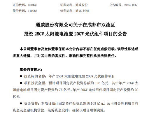 通威股份公告,全资子公司通威太阳能科技有限公司拟与成都市双流区人民政府签署《太阳能光伏产业项目投资合作协议》,就公司在成都市双流区投资建设年产25GW太阳能电池暨20GW光伏组件项目达成合作,本项目预计固定资产投资总额约105亿元。