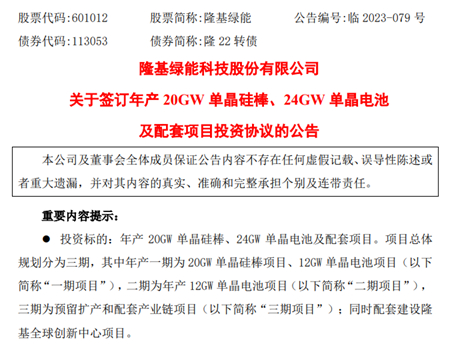 同日,隆基绿能公告,公司(甲方)与西安经济技术开发区管理委员会(乙方)签订《年产20GW单晶硅棒、24GW单晶电池及配套项目投资合作协议》,就公司在陕西省西安市投资建设年产20GW单晶硅棒、24GW单晶电池及配套项目达成合作意向。本项目实施前尚需根据投资金额提交公司内部有权机构审批。