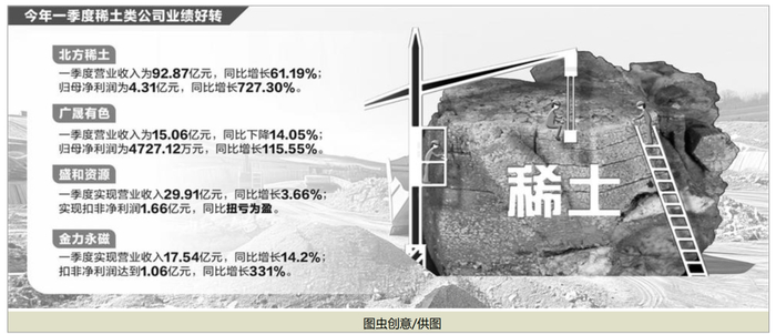 不过得益于稀土市场部分产品价格回升,今年一季度稀土类公司业绩有所好转,比如中国稀土营业收入为7.28亿元,同比增长141.32%。