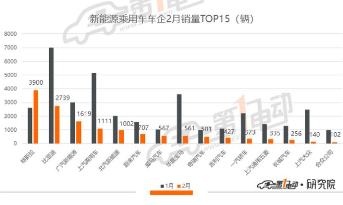另外,新能源乘用车车企2月销量排名前15的车企中,除特斯拉以外,其余车企全部为环比负增长,2月仅有5家车企在总销量上突破了千辆。