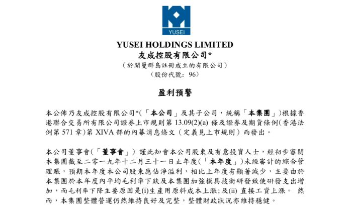 3月16日晚间,友成控股发布盈利预警,表示2019净利显著减少。公告显示,经初步审阅本集团截至2019年12月31日止年度未经审计的综合管理账,预期本年度本公司股东应占净溢利,相比上年度有显著减少。减少的原因主要是由于本集团于本年度内平均毛利率下跌及加强模具技术研发致使硏发支出增加。而毛利率下降主要原因是生产用原料成本上涨,以及直接工资上涨。但是,友成控股表示整体营运仍然维持良好及完整,整体财务状况亦维持稳健。