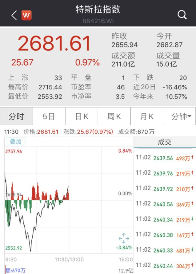 今日,A股特斯拉指数走势呈现“深V”,开盘大涨2%,但随后走低跌至3.84%,截至午间收盘,特斯拉指数再度上扬,涨幅0.97%。