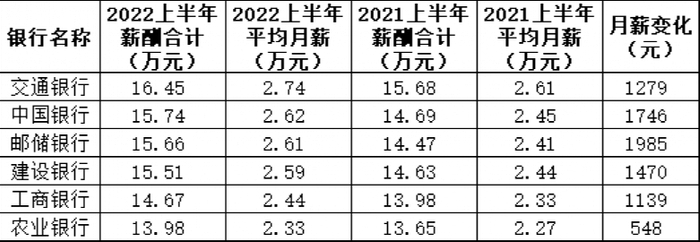 工农中建交和邮储等六大国有银行,上半年平均月薪有所上涨。交通银行以2.74万元的平均月薪在六大行中排位最靠前,中国银行、邮储银行、建设银行的平均月薪均为2.6万左右,工商银行、农业银行则低于2.5万元。