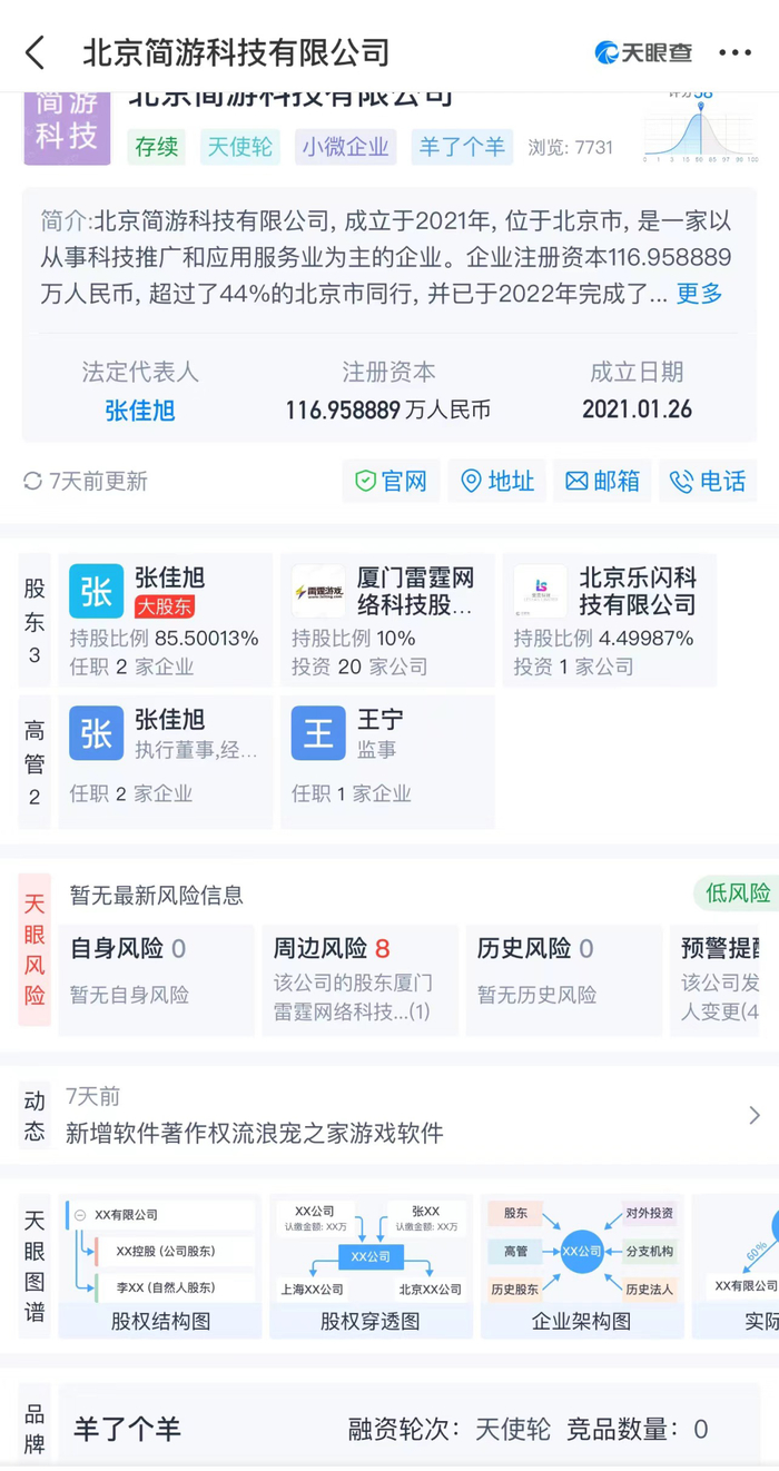 天眼查显示,《羊了个羊》关联公司北京简游科技有限公司成立于2021年1月,注册资本约117万人民币,法定代表人为张佳旭,2021年公司参保人数7人。2022年6月6日,简游科技获得新三板上市公司雷霆股份天使轮融资。股权穿透后可以看到,雷霆股份为A股上市公司吉比特持股60%的控股子公司,纳入吉比特合并报表范围。