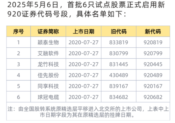 具体来看,共计6只证券代码前三位变更为920,分别是833819(颖泰生物)、830799(艾融软件)、831445(龙竹科技)、430489(佳先股份)、839167(同享科技)、834682(球冠电缆)。北交所新股此前已开启了920代码。股票切换规则是对前三位代码变更为920,后三位不变。