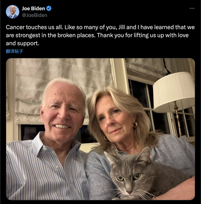 随后,美国现任总统特朗普在其社交媒体平台“真实社交”上发文表示,他和其妻子对于拜登最近的病情诊断深感悲痛,并向拜登及其家人致以最温暖和最美好的祝愿。特朗普祝愿拜登早日康复。