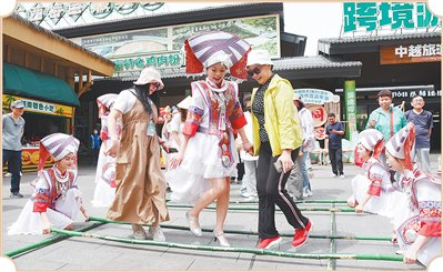 游客在中越德天(板约)瀑布跨境旅游合作区体验民俗。