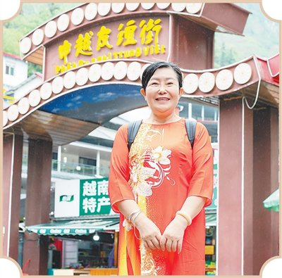 身着“奥黛”的中国游客在中越友谊街前留影。