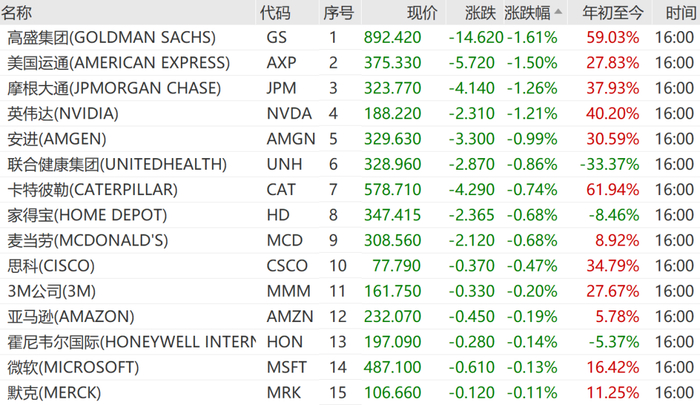 高盛集团跌1.61%,美国运通跌1.50%,摩根大通跌1.26%,领跌道指成份股。