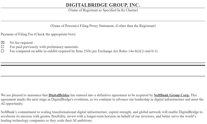 据悉,该交易已获得DigitalBridge董事会特别委员会的一致批准。根据协议,软银将以每股16美元现金的价格收购DigitalBridge所有已发行的普通股。该价格较DigitalBridge 12月26日的收盘价有15%的溢价。