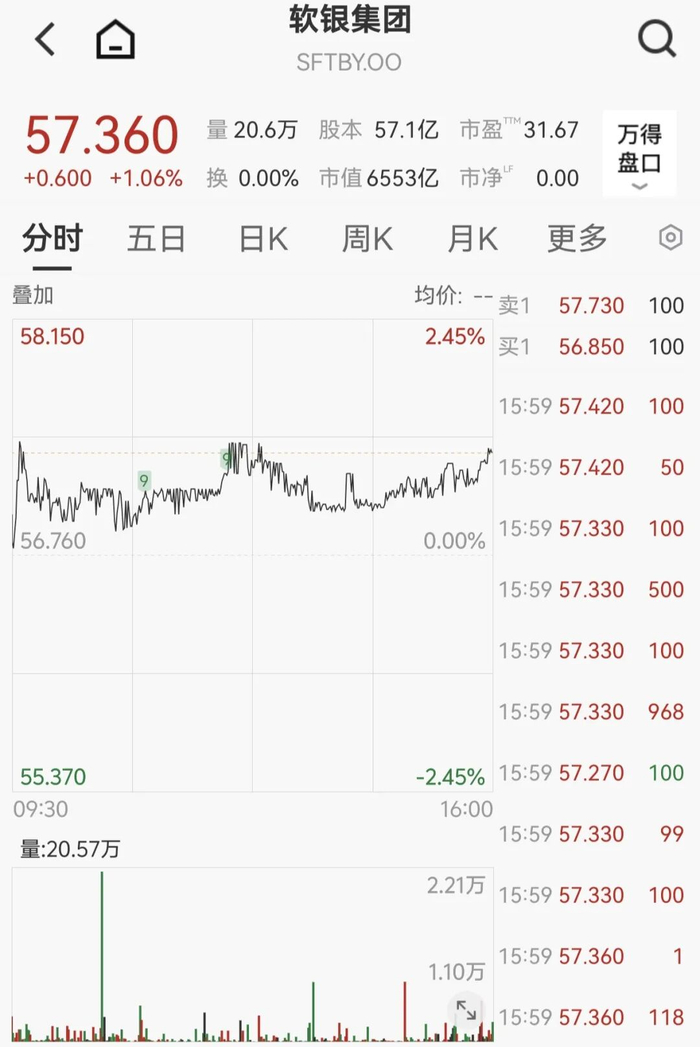 12月29日,软银集团股价也高开高走,全天收于57.36美元/股,涨1.06%。