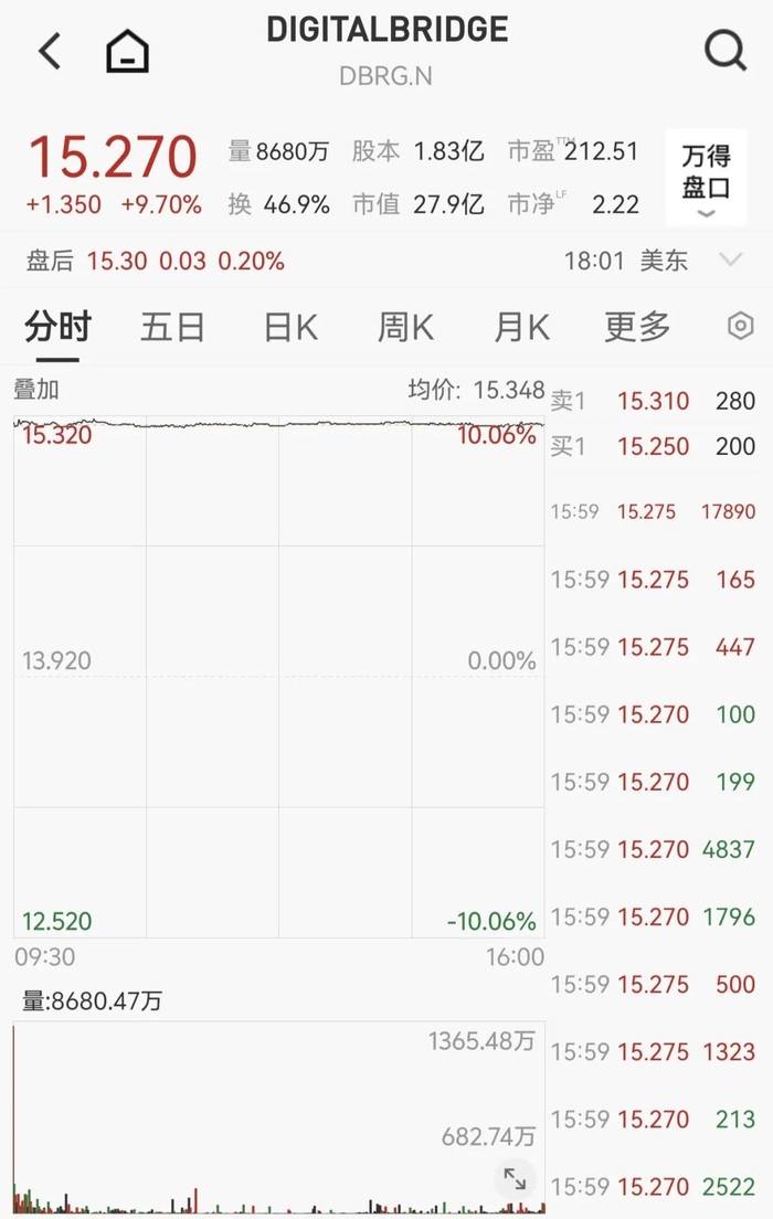 12月29日,DigitalBridge股价大幅高开,最高涨幅达10.06%;全天收于15.27美元/股,涨9.70%。
