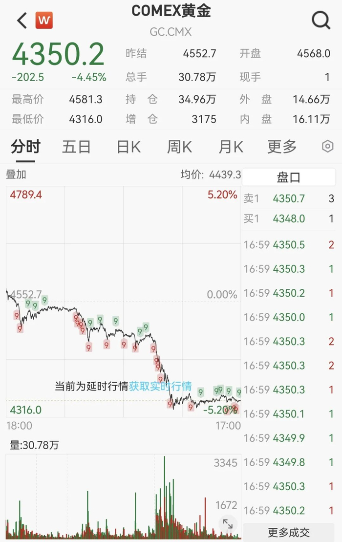 12月29日,国际贵金属期货大幅收跌。COMEX黄金期货跌4.45%,报4350.2美元/盎司;COMEX白银期货跌7.2%,报71.64美元/盎司。