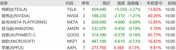 美国科技七巨头中,仅苹果微涨0.13%,其他全部收跌。特斯拉跌3.27%,英伟达跌1.21%,脸书跌0.69%,领跌美国科技七巨头。