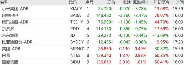 中概股多数下跌,纳斯达克中国金龙指数跌0.67%,万得中概科技龙头指数跌1.43%。