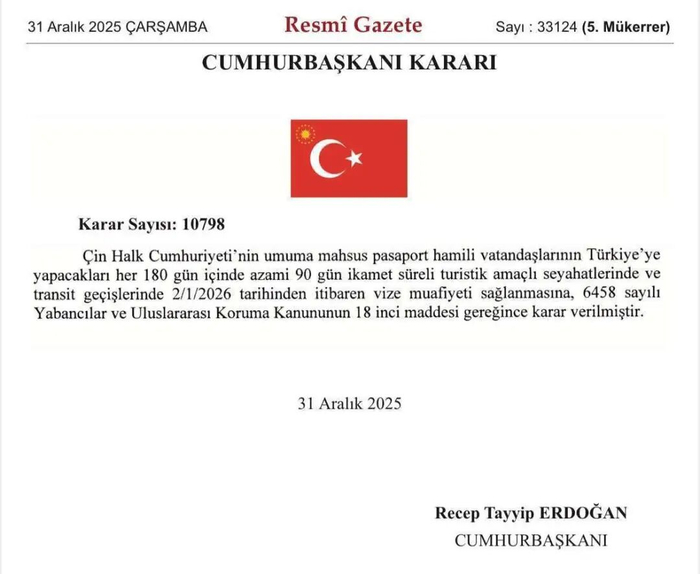 当地时间12月31日,土耳其《官方公报》发布总统令,宣布自2026年1月2日起,对持中国普通护照的公民实行免签入境政策。