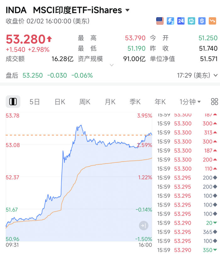 当地时间2月2日,美国总统特朗普宣布,美国对印度的“对等关税”将从25%降至18%,印度将相应降低对美关税和非关税壁垒,直至降至零,并承诺购买价值超过5000亿美元的美国能源等产品。受此影响,在美上市的印度ETF(iShares MSCI India ETF)在盘中直线拉升,一度大涨近4%;印度卢比兑美元汇率亦大幅拉升,日内一度大涨超1%。