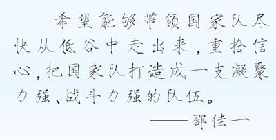 答:我非常理解球迷现在的心情。球迷对待国家队的态度,就像我们辅导自己的孩子写作业,写得不好时,会有种恨铁不成钢的心态。作为国家队主教练,这是一种动力,督促我更好地完成自己的工作。