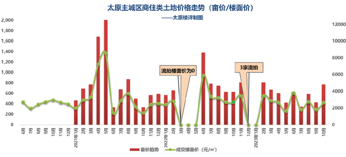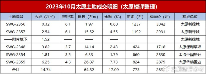 本月亩价因太原广场等核心位置升到773万/亩;受其影响,楼面价达2637元/㎡