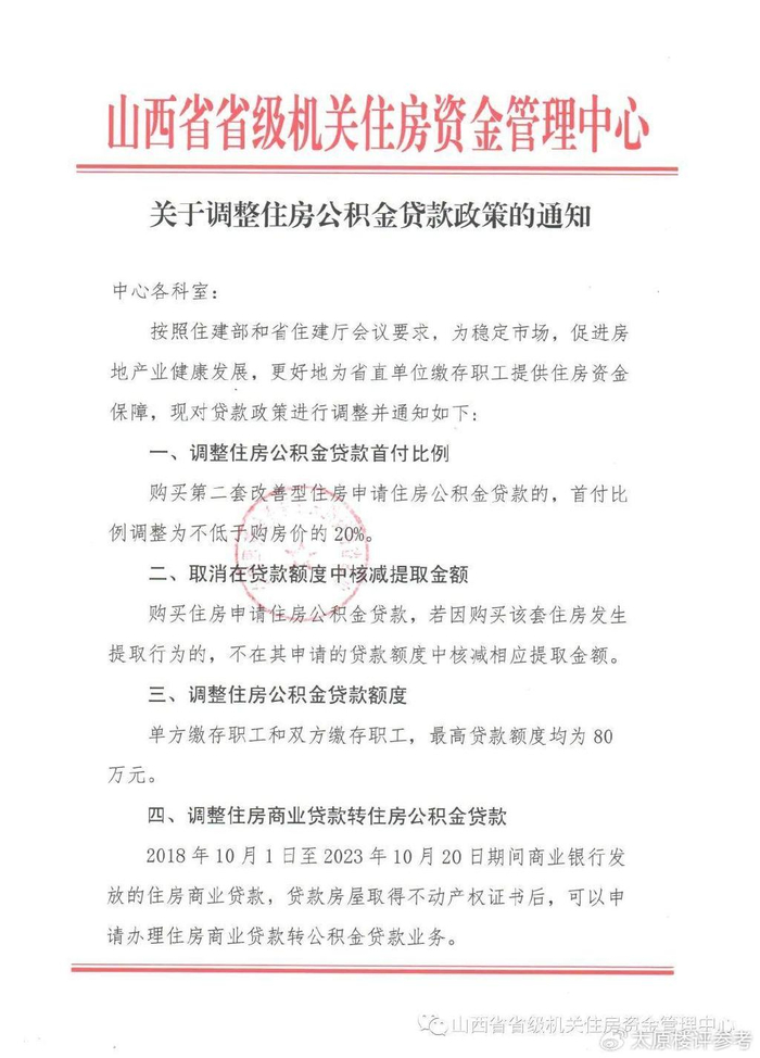 《关于调整住房公积金贷款政策的通知》此次政策调整包括“商转公”、首付比例、贷款额度、购房套数认定标准等。自11月1日起,公积金贷款额度恢复为80万。