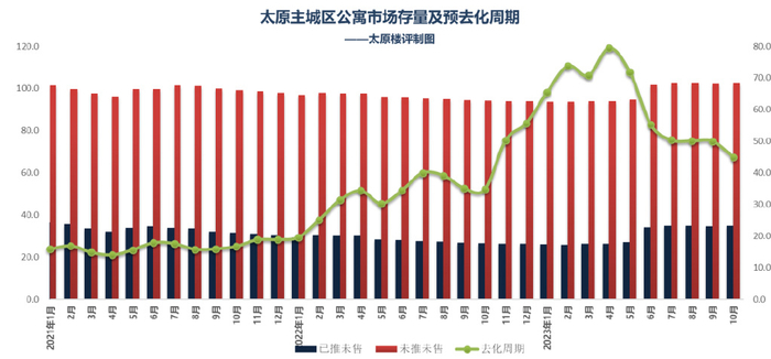 公寓/写字楼已推未售量面积35万㎡,流速0.8万㎡/月,预计去化45月,压力降缓