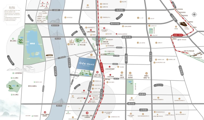 地块周边城市配套资源丰富,禀赋极佳,既有临近汾河的景观视野,也有地铁2号线+嘉节公交枢纽的加持,教育医院商场也极为便利。