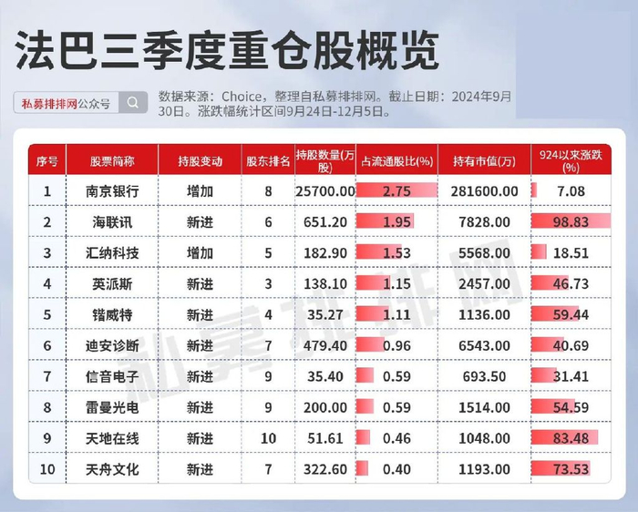 截至三季度末,法巴共重仓持有10家A股公司,“924”行情以来的涨幅均值为49.61%,持有市值合计为30.07亿元。