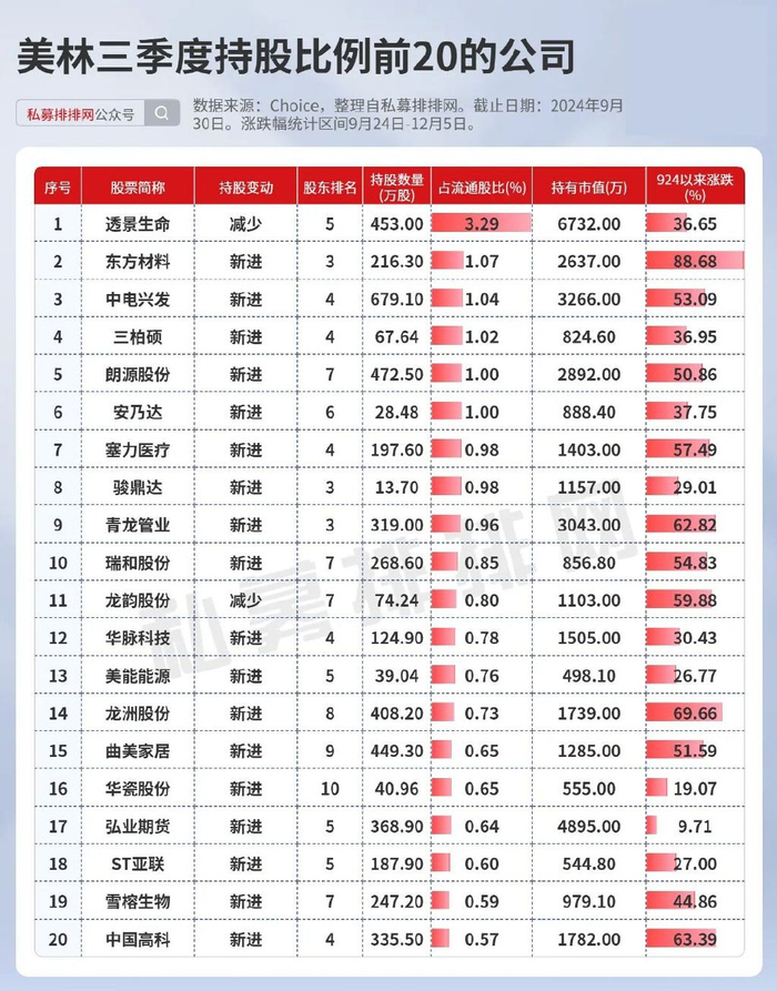 截至三季度末,美林位列A股50家上市公司的前十大流通股东名单,“924”行情以来涨幅均值为48.86%,合计持有市值约为7.14亿元。