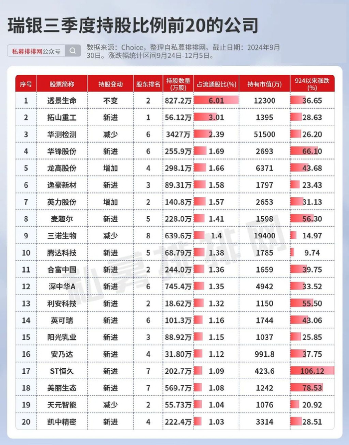 从持股比例来看,持股比例最高的是透景生命,三季度瑞银持有827.2万股,持有市值1.23亿元,“924”行情以来涨幅为36.65%,预计将带来浮盈为4428万元。