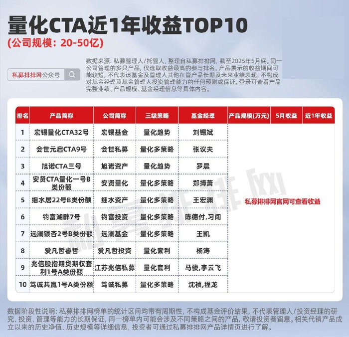 私募排排网数据显示,管理规模在20-50亿的私募中,量化CTA产品近1年收益均值为16.08%,并且全部实现正收益。近1年收益居前3的产品分别来自于宏锡基金、会世私募、旭诺资产。